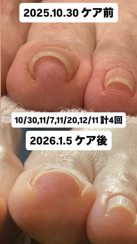 痛みの原因である皮膚に食い込んだ爪は、ケアによって皮膚から離れるので、物理的な痛みはケア直後から無くなります。