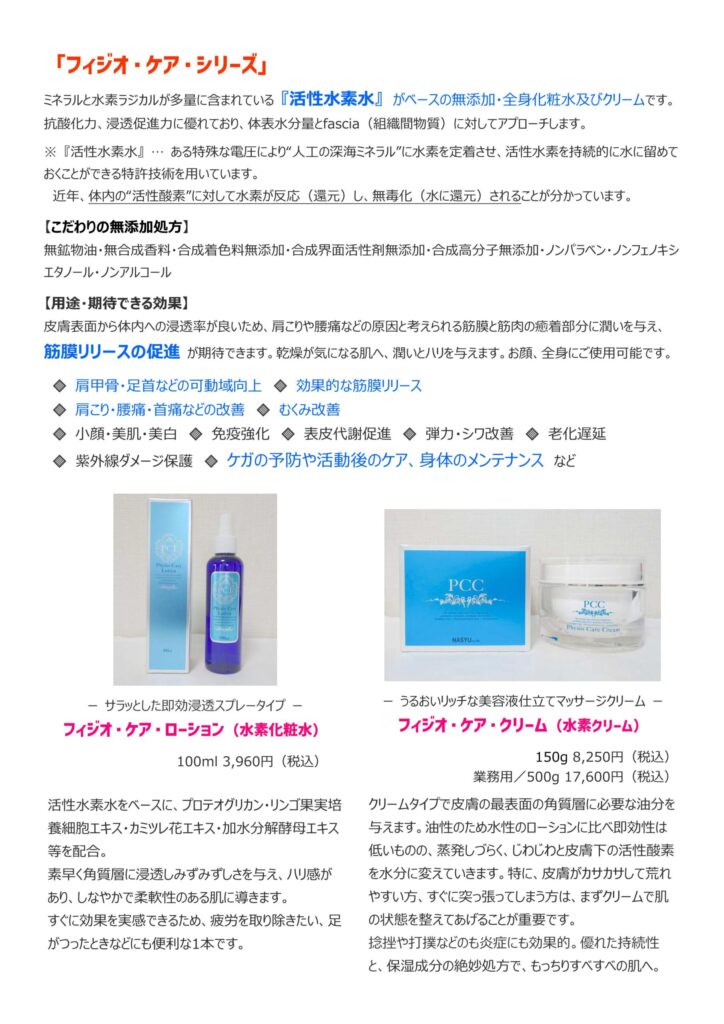 保湿及びマッサージには、ヤマツルで取り扱っておりますオリーブ基礎化粧品や、水素のクリームをご利用いたします。
